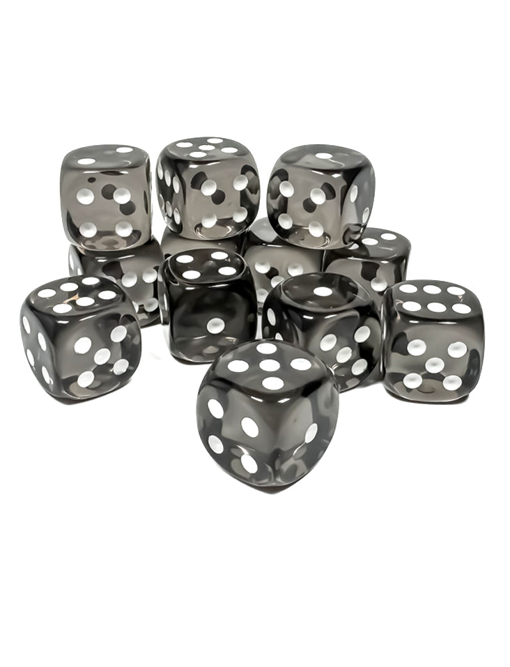 Each set contains 12 Translucent Smoke 16mm D6 dice with white pips.