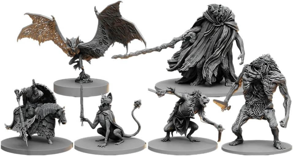 Intricately detailed miniatures of Tarnished heroes, enemies, and the fearsome Grafted King boss.
