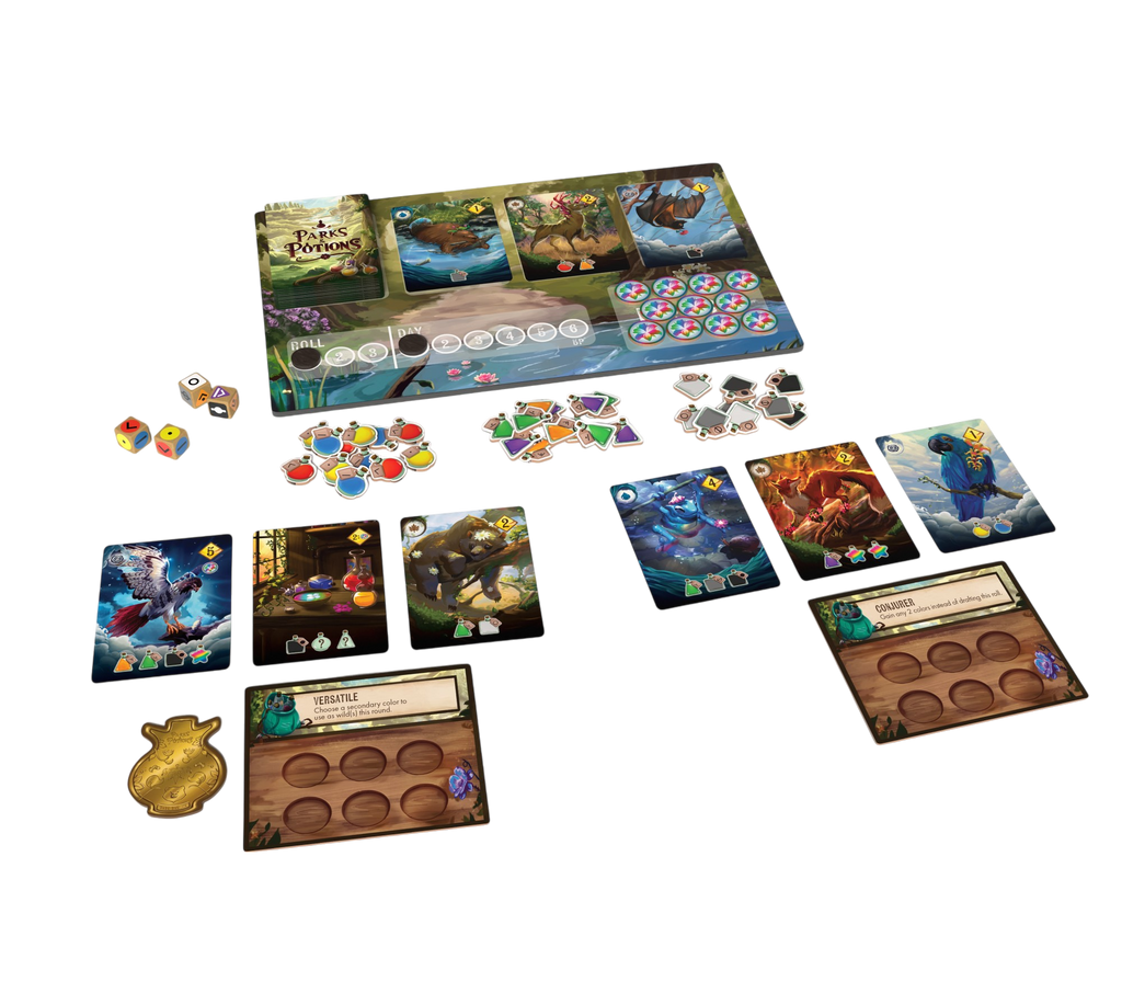 Step into the role of a devoted park ranger in Parks & Potions, a light strategy board game where nature and magic intertwine. Wander through enchanting biomes, harvest rare botanical extracts, brew restorative potions, and heal the creatures of the forest before the day ends. Easy to learn yet deeply rewarding, Parks & Potions brings cozy adventure and clever resource management to your table.