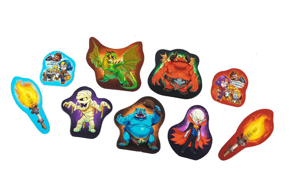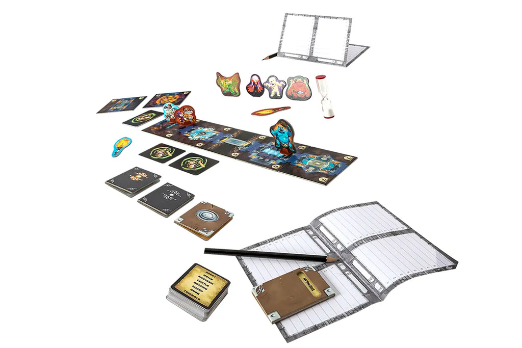 Navigate through a fantasy-themed dungeon filled with monsters, curses, and surprises, or opt for classic word sets for a timeless challenge. Packed with 50 double-sided word cards (400 fantasy and 400 standard words), 10 monster cards, 10 curse cards, 7 room tiles, and more, Trapwords offers endless replayability and laughter.